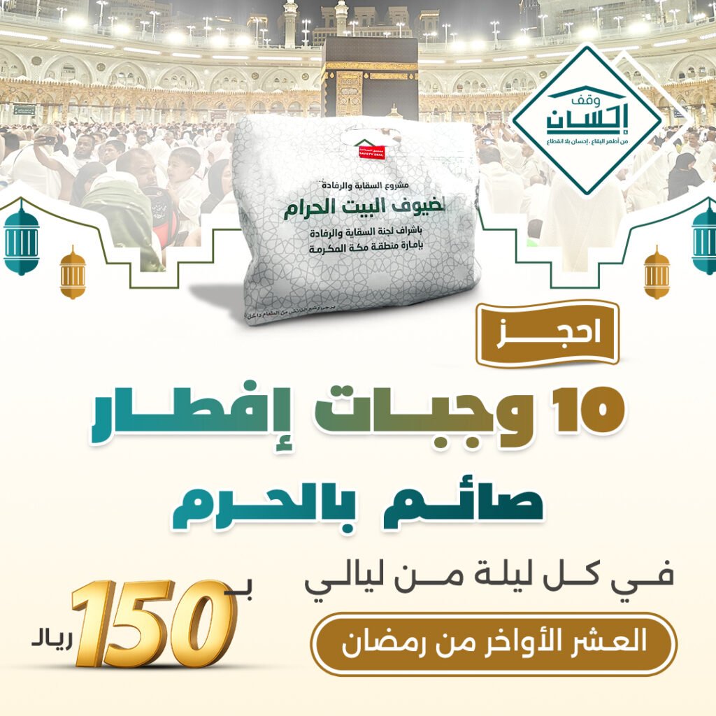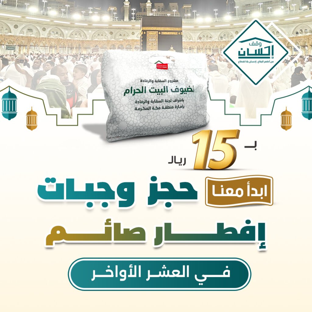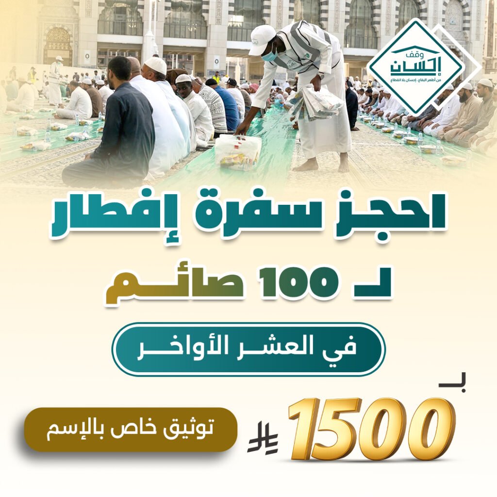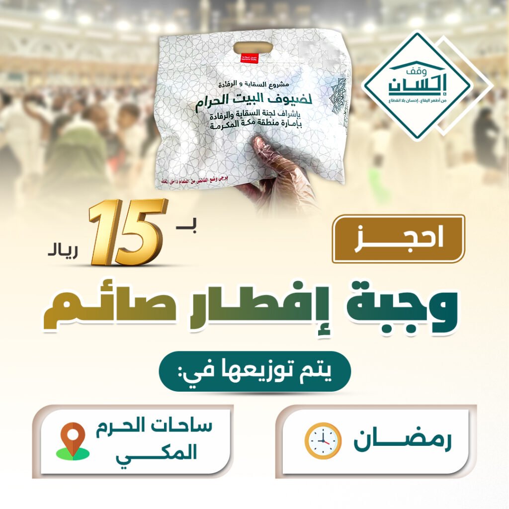ساهم في عملٍ عظيم من أعمال الخير من خلال حجز سفرة إفطار باسمك في العشر الأواخر من رمضان عبر منصة وقف إحسان، وكن سببًا في تفطير الصائمين ونيل الأجر المضاعف في أفضل أيام الشهر المبارك.