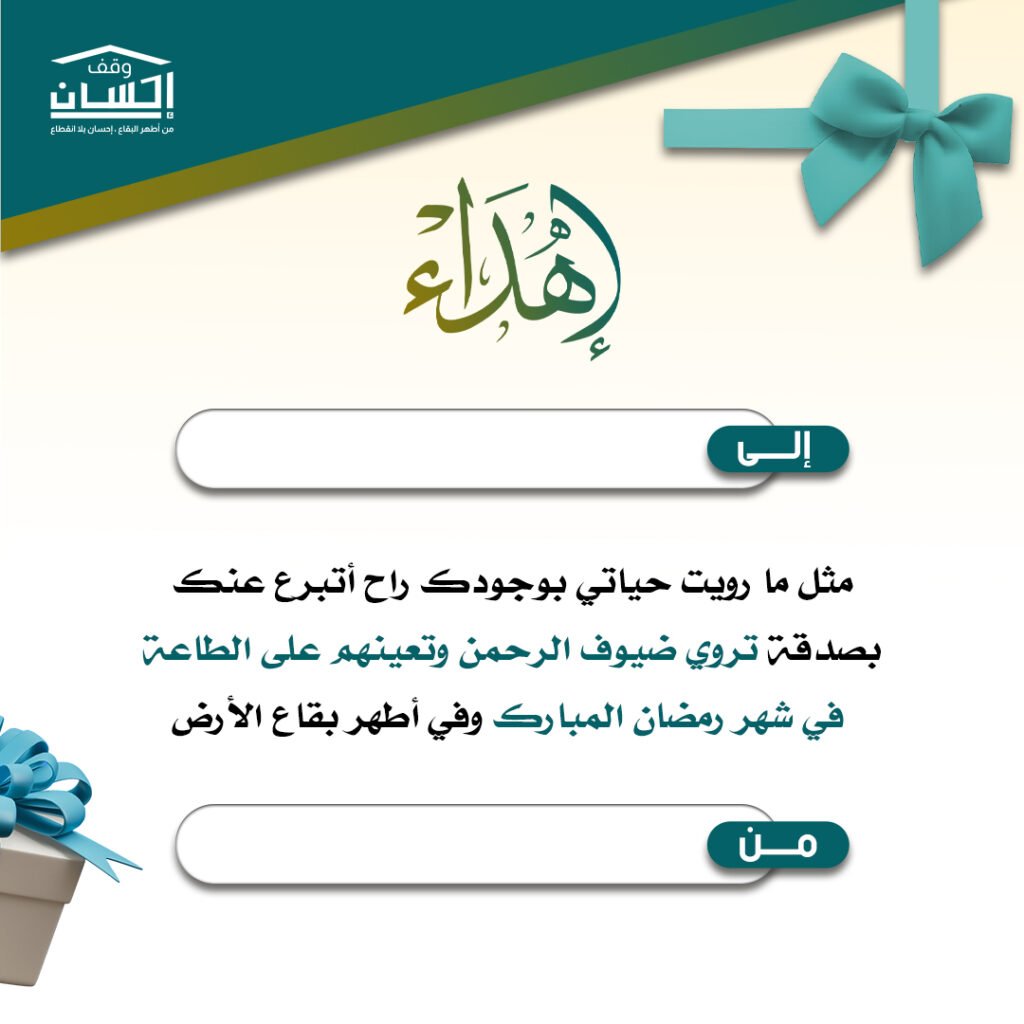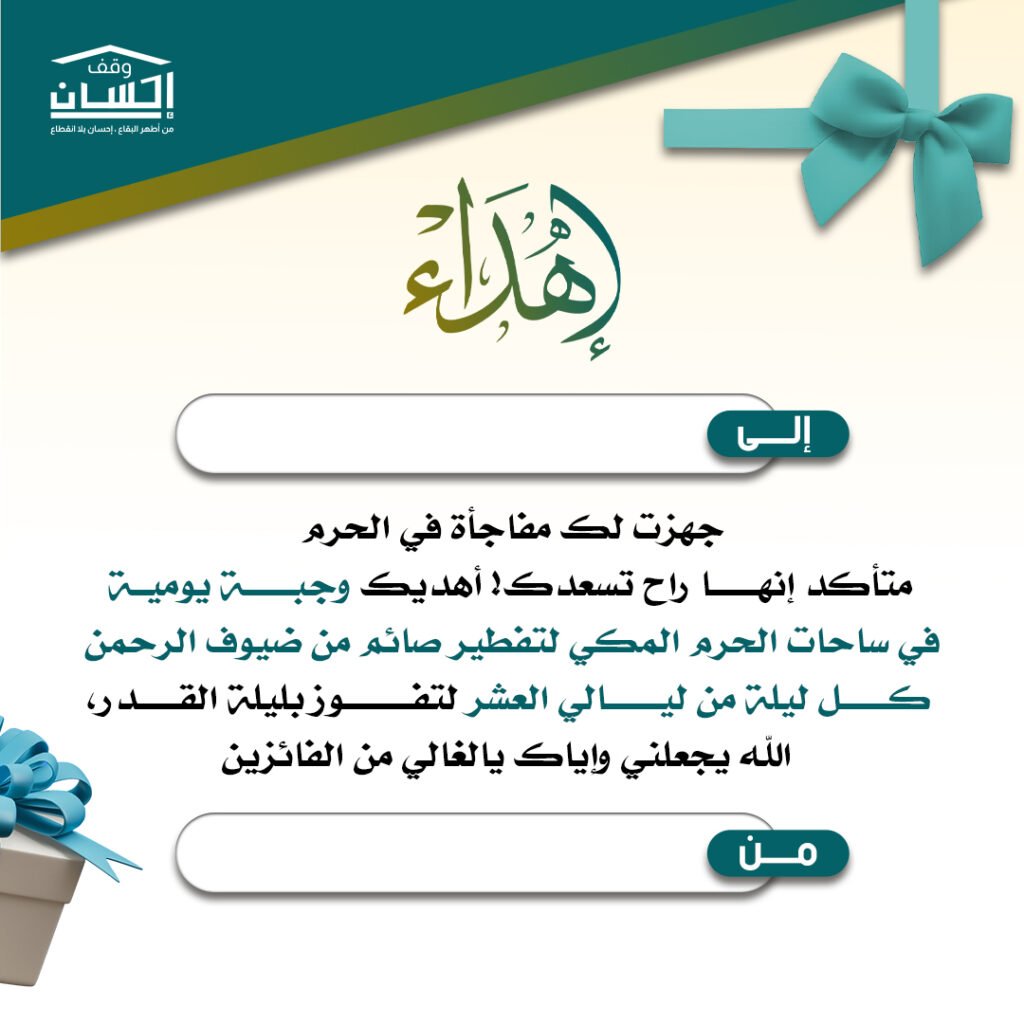 يمكنك الآن إهداء مشروع إفطار العشر الأواخر باسم من تحب عبر منصة وقف إحسان، لتكون صدقة مباركة تساهم في تفطير الصائمين ونيل الأجر العظيم في أفضل أيام شهر رمضان.