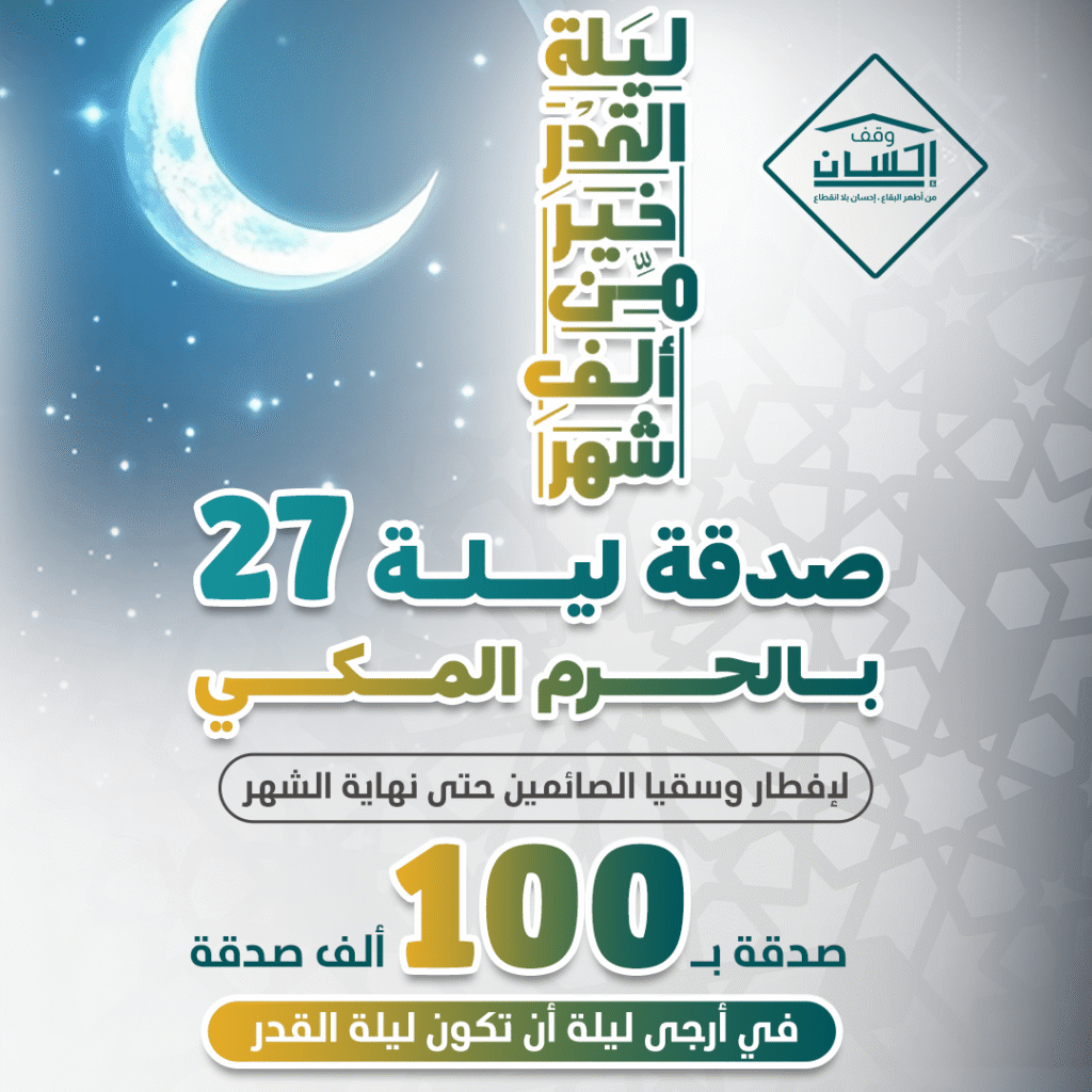 ساهم في نشر الخير في أعظم ليالي شهر رمضان المبارك من خلال حجز سفرة إفطار ليلة 27 رمضان عبر منصة وقف إحسان، وكن سبباً في تفطير الصائمين وإدخال السرور على قلوب المحتاجين.