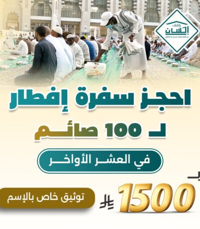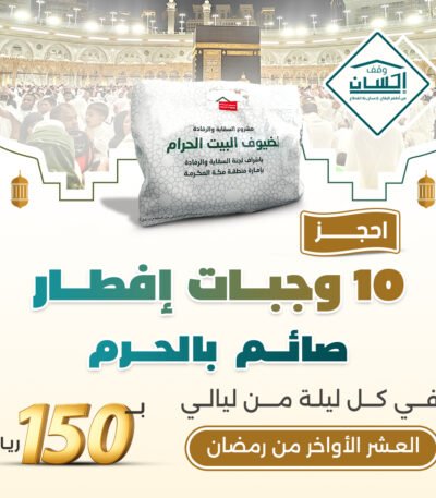 ساهم في عملٍ عظيم من أعمال الخير من خلال حجز سفرة إفطار باسمك في العشر الأواخر من رمضان عبر منصة وقف إحسان، وكن سببًا في تفطير الصائمين ونيل الأجر المضاعف في أفضل أيام الشهر المبارك.