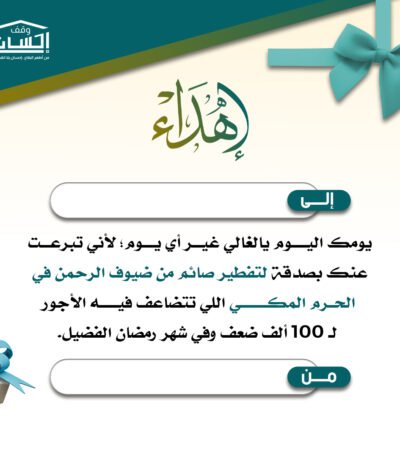 يمكنك الآن إهداء صدقة في الحرم المكي باسم من تحب من خلال مشروع تفطير الصائمين عبر منصة وقف إحسان، لتكون هدية مباركة تحمل الأجر والثواب في شهر رمضان الكريم.