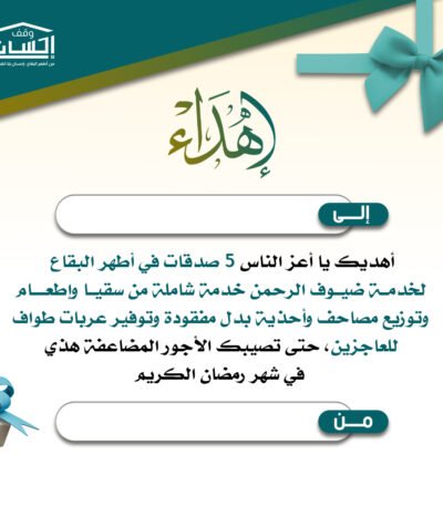 يمكنك الآن إهداء مشروع أجورك الخمسة باسم من تحب عبر منصة وقف إحسان، ليكون هدية مباركة تحمل الأجر والثواب وتساهم في نشر الخير في شهر رمضان المبارك.