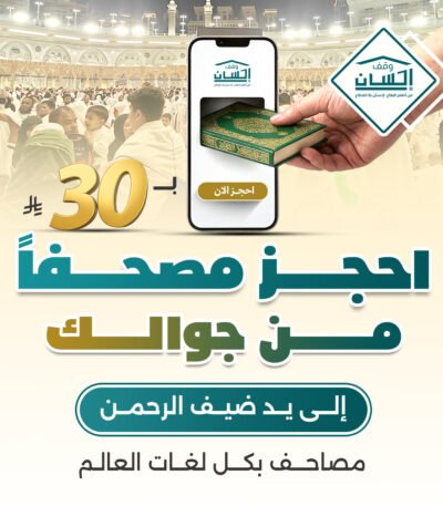 يمكنك الآن التبرع بمصحف من جوالك بسهولة عبر منصة وقف إحسان، والمساهمة في نشر كتاب الله حول العالم لتكون هذه الصدقة صدقة جارية يصل أجرها إليك مع كل حرف يُتلى من القرآن الكريم.