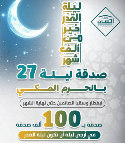 ساهم في نشر الخير في أعظم ليالي شهر رمضان المبارك من خلال حجز سفرة إفطار ليلة 27 رمضان عبر منصة وقف إحسان، وكن سبباً في تفطير الصائمين وإدخال السرور على قلوب المحتاجين.