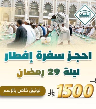 ساهم في نشر الخير في واحدة من أعظم ليالي شهر رمضان المبارك من خلال حجز سفرة إفطار ليلة 29 رمضان عبر منصة وقف إحسان، وشارك في تفطير الصائمين وإدخال السرور على قلوب المحتاجين.