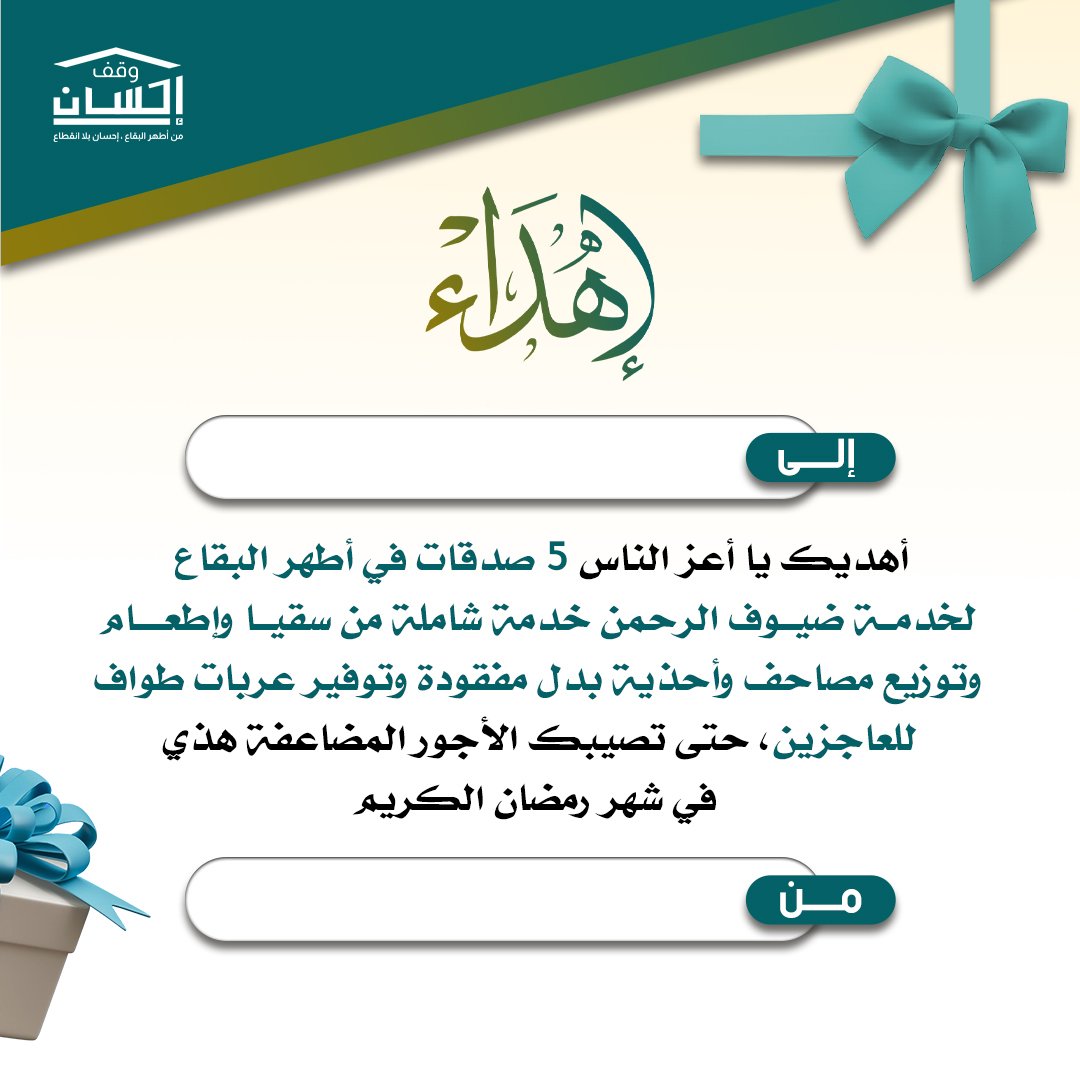 يمكنك الآن إهداء مشروع أجورك الخمسة باسم من تحب عبر منصة وقف إحسان، ليكون هدية مباركة تحمل الأجر والثواب وتساهم في نشر الخير في شهر رمضان المبارك.