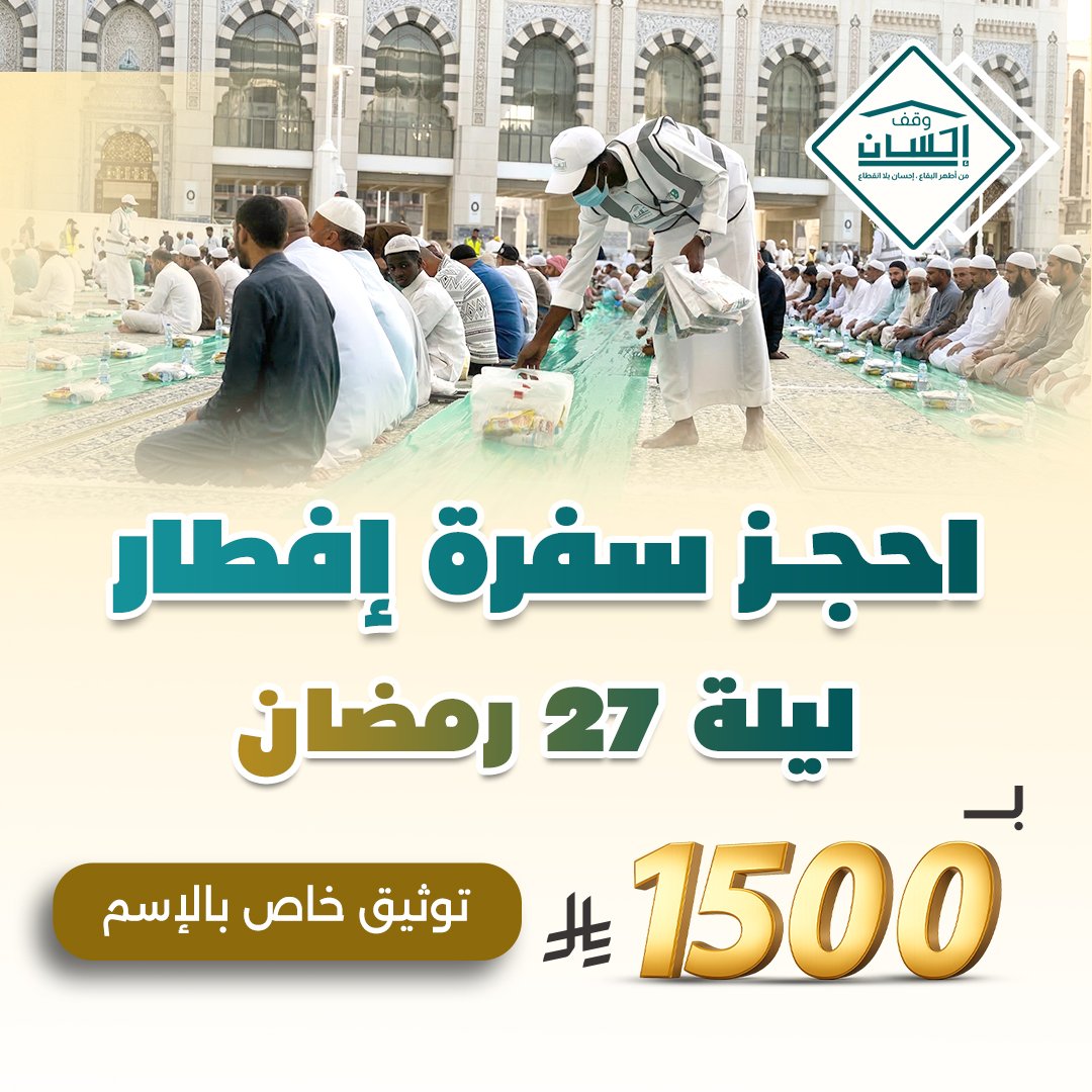 ساهم في نشر الخير في أعظم ليالي شهر رمضان المبارك من خلال حجز سفرة إفطار ليلة 27 رمضان عبر منصة وقف إحسان، وكن سبباً في تفطير الصائمين وإدخال السرور على قلوب المحتاجين.